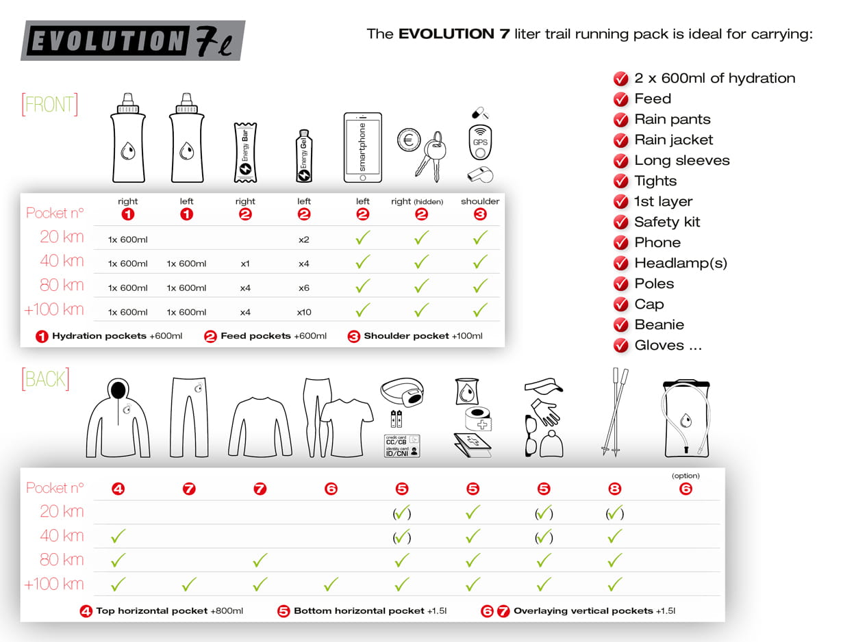 2 600ml refueling pockets + internal elastic cord. Large storage volume and perfect accessibility. (right: +1 hidden hem pocket // left: +1 over-pocket)