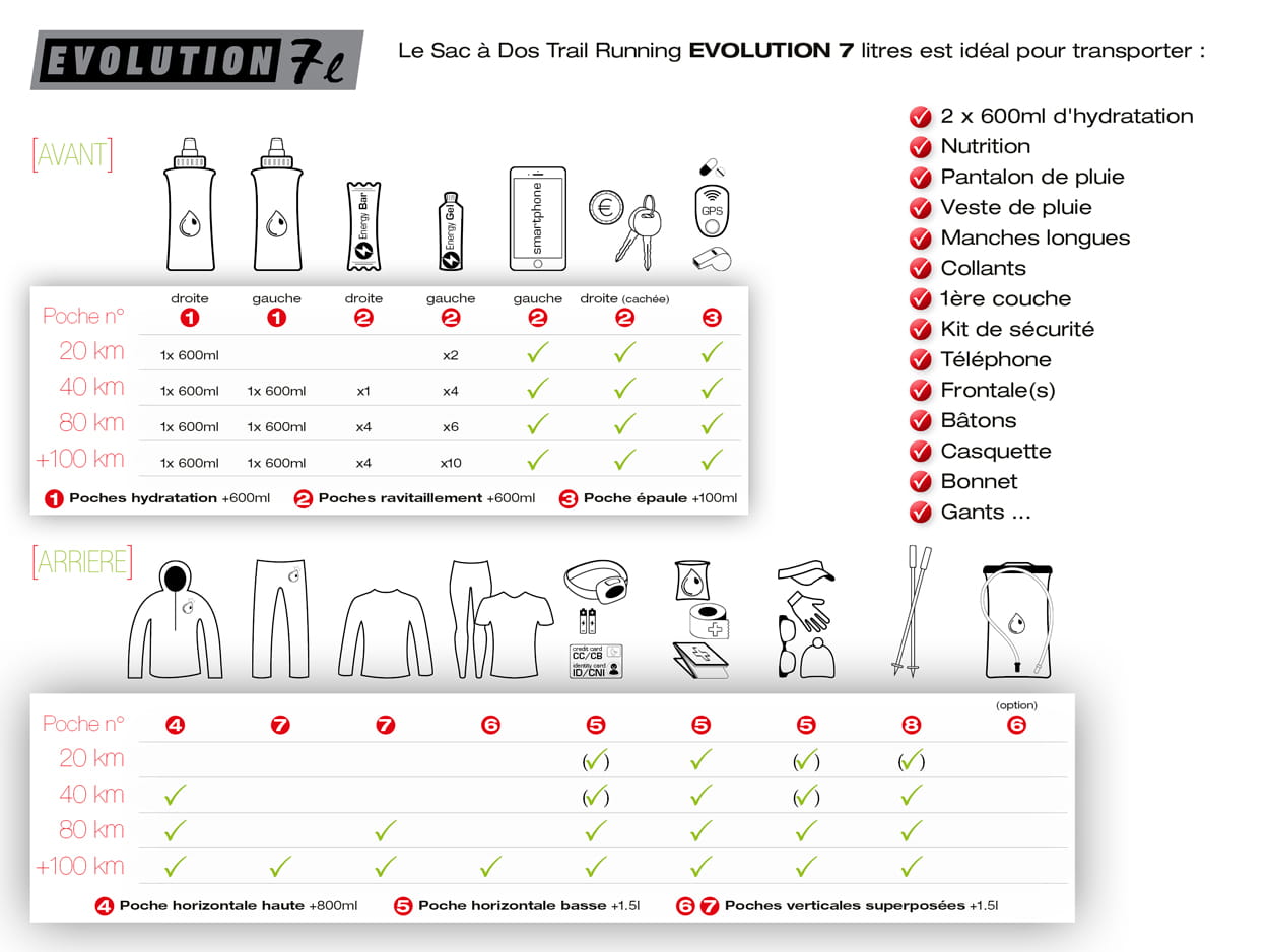 1 high horizontal pocket of 800ml + elastic self-locking compression cord. Access without removing the bag to your rain jacket from the first drops!