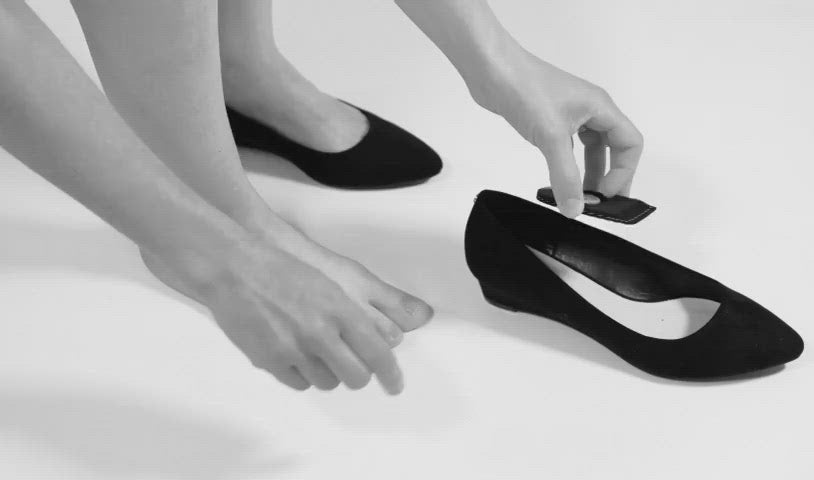 Before 1st use, remove the protective film covering the double-sided adhesive, then position the heel pads in the shoe.