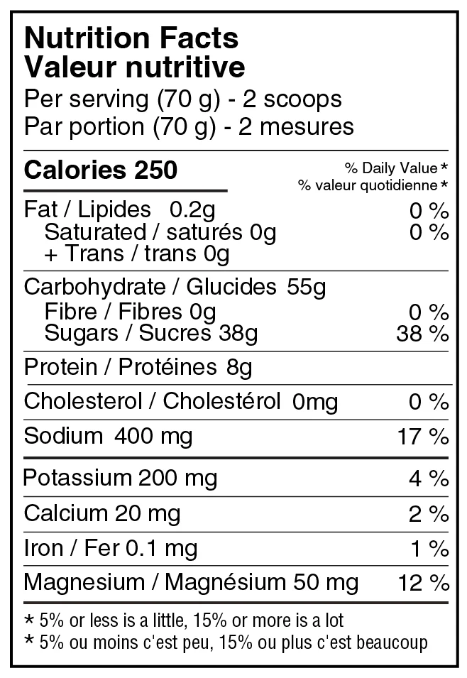 Sugars (dextrose, maltodextrin, Palatinose™ (isomaltulose)*), canola protein isolate, sea salt, potassium citrate, magnesium citrate.